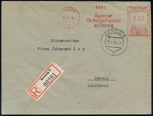 1186 | 60 € | FREIE STADT DANZIG (1920 - 1939) & DANZIG BIS 1944 : DANZIG/ 5/ Kammer/ für Außenhandel/ zu Danzig 1938 (23.4.) sehr seltener AFS Francotyp "Stadtwappen" 030 Pf. + fünfstelliger RZ: Danzig 5 + 2K-Steg: DANZIG 5/a, Orts-R-Bf. (Handbuch Nr.166) | ![]() | |