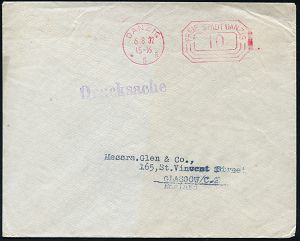 1183 | 35 € | FREIE STADT DANZIG (1920 - 1939) & DANZIG BIS 1944 : DANZIG/ 1/ Commerz-/ und/ Privat-Bank 1935 (11.8.) AFS Francotyp "Bogenrechteck": FREIE STADT DANZIG 055 Pf. + RZ: Danzig 1/q , rs. rot-schw. Siegel-Oblate CPB, Inl.-R-Bf. n. Hamburg, seltene Portostufe! (Handbuch Nr.9) | ![]() ![]() | |