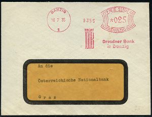 1182 | 30 € | FREIE STADT DANZIG (1920 - 1939) & DANZIG BIS 1944 : DANZIG/ 1/ DB/ Dresdner Bank/ in Danzig 1936 (18.7.) AFS Francotyp Bogenrechteck "FREIE STADT DANZIG" *025 Pf. seltener Ausl.-Bf., seltene Portostufe! (Handbuch Nr.28) | ![]() | |
