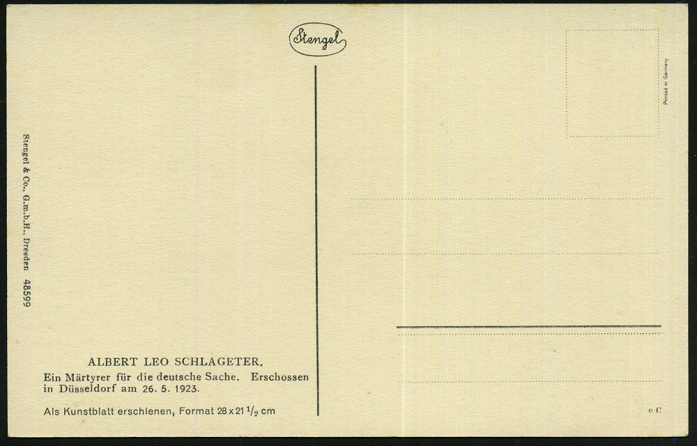 1257 | 18 € | NS-VORLÄUFER : Düsseldorf 1923 s/w.-Propaganda-Ak.: ALBERT LEO SCHLAGETER, Ein Märtyrer für die deutsche Sache.. militanter NSDAP-Aktivist im Widerstand während der Rheinlandbesetzung, von französ. Militär erschossen am 26.5.1923, NS-Märtyrer, ungebr. (Verl. Stengel, Dresden) | ![]() ![]() | |
