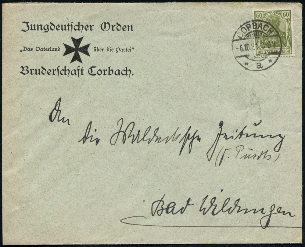 1259 | 25 € | NS-VORLÄUFER : Korbach 1921 (6.10.) 1K-Gitter: CORBACH/* a * auf Vordr.-Bf.: Jungdeutscher Orden "Das Vaterland über die Partei!", Bruderschaft Corbach (Malteser Kreuz) gegr. 1920, im selben Jahr an der Niederschlagung des Ruhr-Aufstandes beteiligt, anti-semitische, anti-bolschwistische Organisation, dennoch 1933 von Nazis verboten, berühmtes Mitglied Harro Schulze-Boysen ("Rote Kapelle"), seltener Fern-Bf. (Mi.147) | ![]() | |