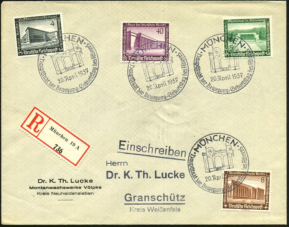 1261 | 25 € | NS-VORLÄUFER : MÜNCHEN/ Hauptstadt der Bewegung - Geburtstag des Führers 1937 (20.4.) SSt = Feldherrnhalle ,Schauplatz des Hitler-Putsches im Nov. 1923 ,4x auf guter WHW-Frankatur (Mi.642 u.a., + 16,50 EUR) + RZ: München 19 A, klar gest. Inl.-R-Bf., rs. AS. (Bo.93) | ![]() | |