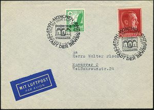 1260 | 20 € | NS-VORLÄUFER : MÜNCHEN/ HDB/ Und ihr habt doch gesiegt/ 9.11.1923.. 1938 (9.11.) SSt = Feldherrnhalle, Schauplatz von Hitlers November-Putsch 1923 2x klar gest. auf 12 + 38 Pf. Hitler (Mi.529, 664) portorichtiger Inl.-Flp.-Bf. (Bo.121) | ![]() | |