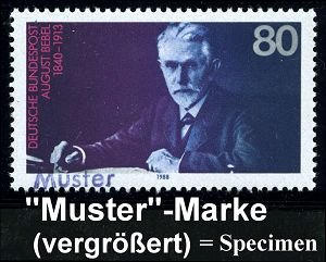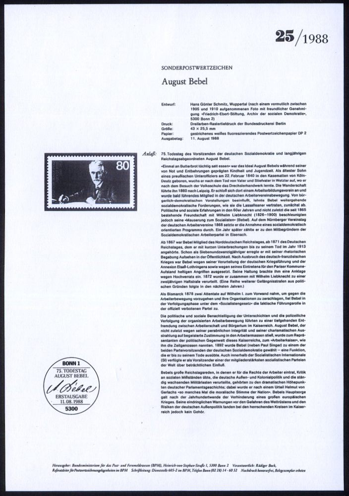 86 | 25 € | ARBEITERBEWEGUNG 1848-1933 : B.R.D. 1988 (Aug.) 80 Pf. "75.Todestag August Bebel" mit amtl. Handstempel "M u s t e r" , postfr. + amtl. Ankündigungslatt der Bundespost-Ministeriums (Format A4 mit s/w.-Abb.) 2 Belege kompl.!, selten! (Mi.1382 Muster = Specimen) | ![]() ![]() | |