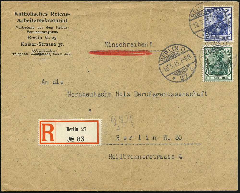 70 | 16 € | ARBEITERBEWEGUNG 1848-1933 : BERLIN O/ *27b 1915 (10.3.) 1K-Gitter auf Vordruck-Bf.: Katholischer Reichs-Arbeitersekretariat, Vertretung vor dem Reichs-Versicherungsamt (Bf. Vertikalfalte) + gez. RZ: Berlin 27, klar gest. Orts-R-Bf. (Mi.85, 87) | ![]() | |