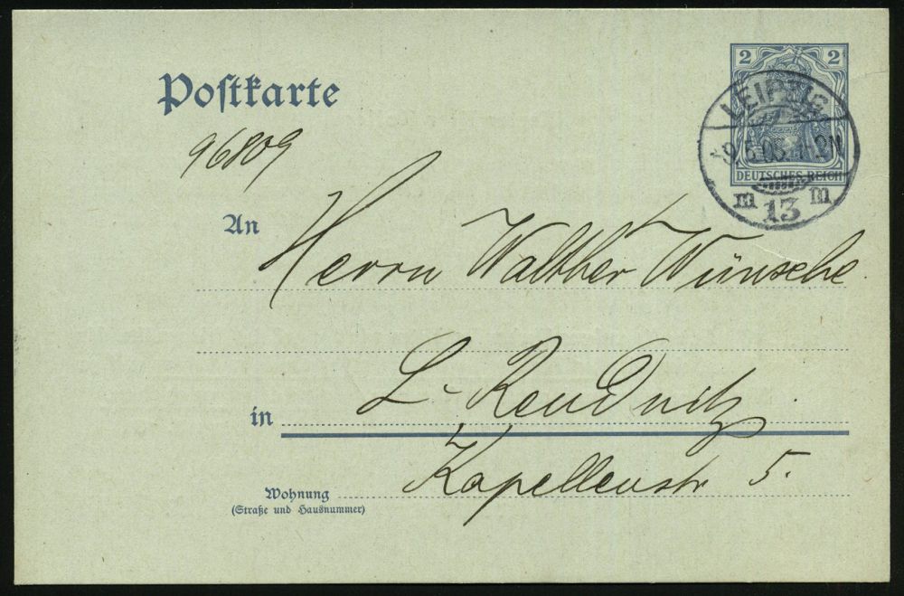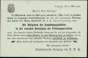 80 | 20 € | ARBEITERBEWEGUNG 1848-1933 : LEIPZIG/ m13m 1905 (9.5.) 1K-Gitter auf Orts-P 2 Pf. Germania + rs. Zudruck: D.H.V. Vortrag über "Die Aufgaben der Hand-lungsgehülfen in der sozialen Bewegung der Privatangestellten" (Logo Verband Deutscher Handlungsgehilfen) Ortskt., selten! (Mi.PZD 63 X) | ![]() ![]() | |