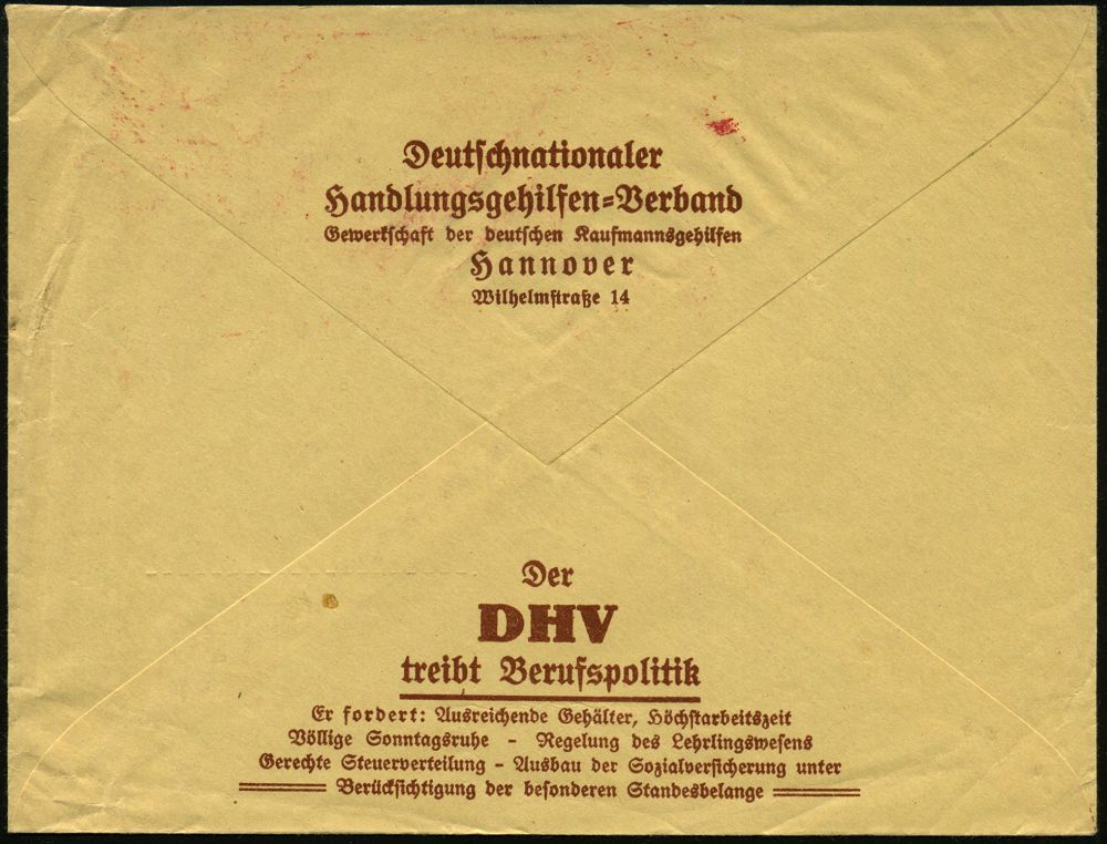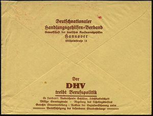 78 | 20 € | ARBEITERBEWEGUNG 1848-1933 : HANNOVER/ 1/ DHV/ Deutschnationaler/ Handlungsgehilfen-/ Verband.. 1932 (20.1.) AFS Francotyp "Mäanderrechteck" (Monogr.: DHV) motivgl. , dekorativer Vordruck-Bf., rs. Reklame: Mitgliederwerbung! (Dü.E-2CEh) | ![]() ![]() | |