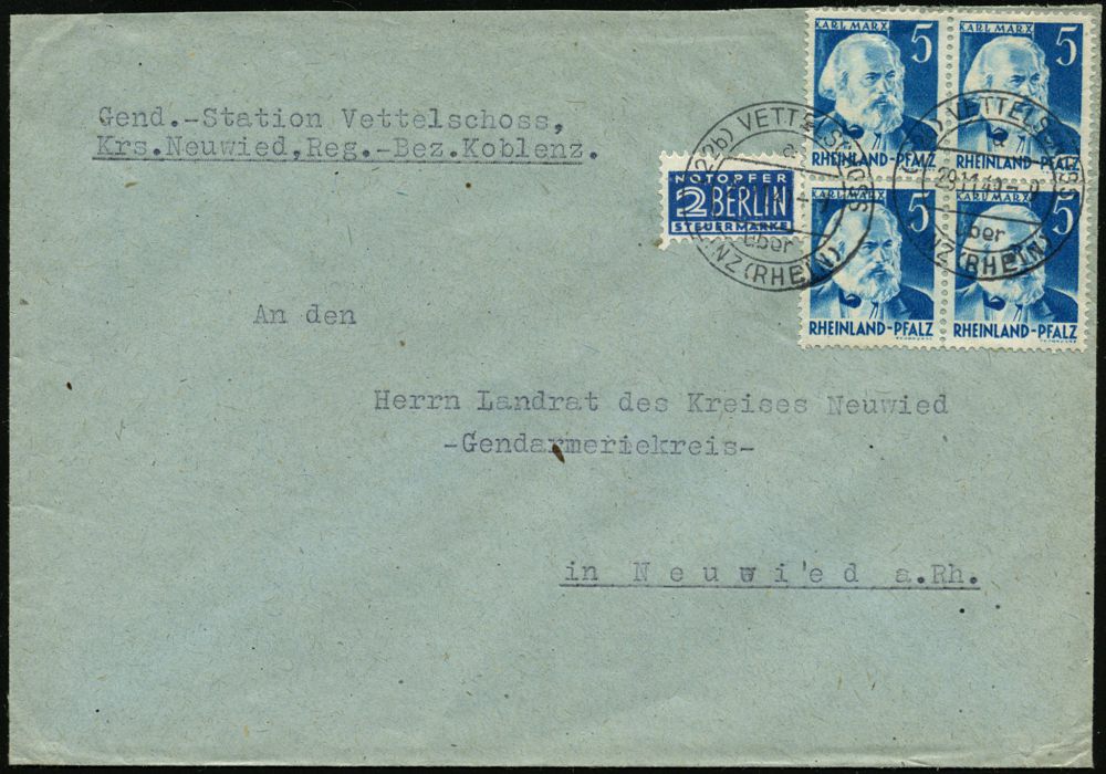 84 | 20 € | ARBEITERBEWEGUNG 1848-1933 : (22b) RHEINLAND PFALZ 1949 (29.11.) 5 Pf. Karl Marx, reine MeF: 4er-Block + 2 Pf. NoB, klar gest. (22 b) VETTELSCHOSS/a/ über/LINZ (RHEIN), Fern-Bf. (Mi.34 MeF) | ![]() | |
