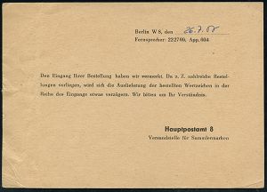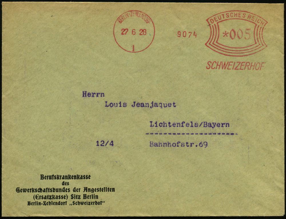 71 | 18 € | ARBEITERBEWEGUNG 1848-1933 : BERLIN-ZEHLENDORF/ 1/ SCHWEIZERHOF 1928 (27.6.) AFS Francotyp "Bogenrechteck" klar auf Vordruck-Bf.: Berufskrankenkasse des Gewerkschaftsbundes der Angestellten (Dü.E-1Am) | ![]() | |