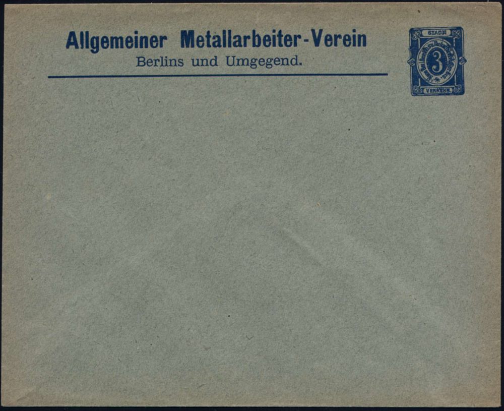 69 | 20 € | ARBEITERBEWEGUNG 1848-1933 : Berlin 1890 "Neue Berliner Omnibus- & Packetfahrt AG" Privatpost-U 3 Pf. Ziffer, blau: Allgem. Metallarbeiter-Verein Berlins.. , ungebr., früher Thematik-Beleg zur Arbeiterbewegung, selten! | ![]() | |