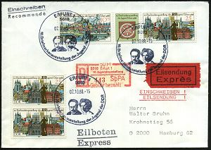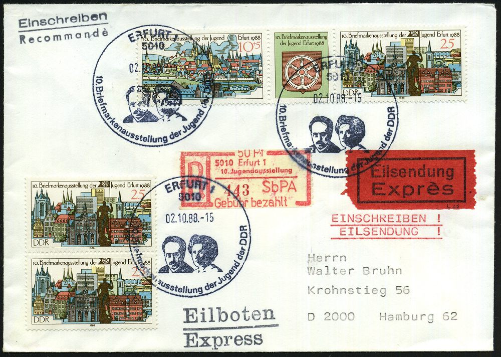 77 | 18 € | ARBEITERBEWEGUNG 1848-1933 : 5010 ERFURT 1/ 10.Briefmarkenausstellung der Jugend.. 1988 (2.10.) SSt = Karl Liebknecht, Rosa Luxemburg 3x auf passender Frankatur "10. Brief.-Ausst. Erfurt" (Zus.-Druck, Paar 25 Pf.) + Selbstbedienungs-PA.-Sonder-RZ: 50 Pf./ 5010 Erfurt 1/10. Jugendausstellung/ SbPA/ Gebühr bezahlt, klar gest. BRD-Eil-R-Bf. n. Hamburg, rs. AS. (Mi.2x 3175, WZd.748) | ![]() | |