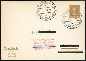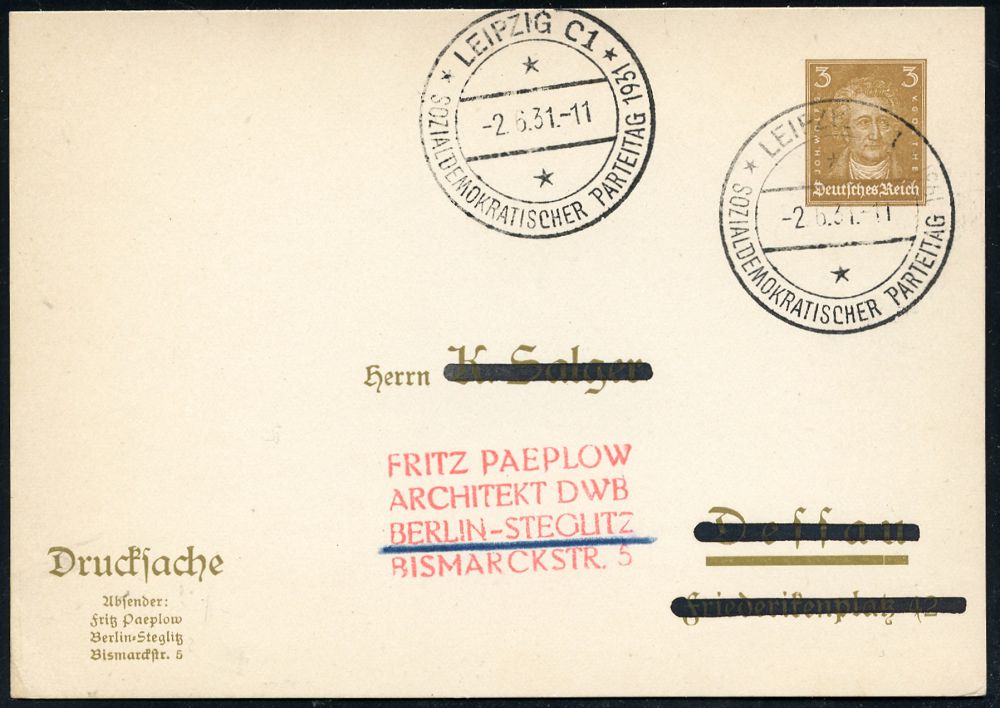 81 | 18 € | ARBEITERBEWEGUNG 1848-1933 : LEIPZIG C1/ SOZIALDEMOKRATISCHER PARTEITAG 1931 (5.6.) seltener SSt klar auf aptierter PP 3 Pf. Goethe, klar gest. Inl.-Karte (Bo.89) | ![]() | |