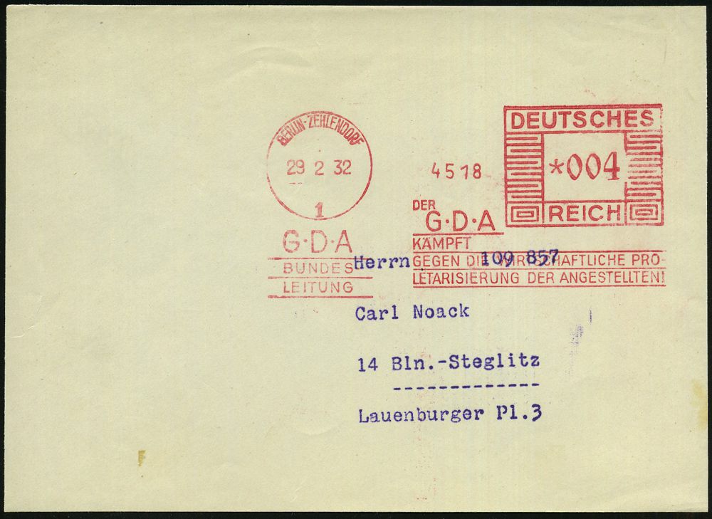 72 | 16 € | ARBEITERBEWEGUNG 1848-1933 : BERLIN-ZEHLENDORF/ 1/ DER/ GDA/ KÄMPFT GEGEN DIE..PRO/ LETARISIERUNG DER ANGESTELLTEN 1933 (29.2.) seltener AFS Francotyp "Mäanderrechteck" des Gewerkschaftsbundes der Angestellten, n a c h der Machtergreifung! (31.1.1933) klar gest. Orts-Vorderseite (Dü.E-2A) | ![]() | |