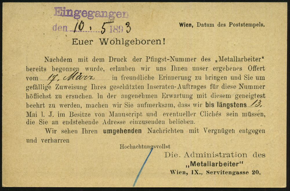 87 | 18 € | ARBEITERBEWEGUNG 1848-1933 : ÖSTERREICH 1893 (9.5.) amtl. P 2 H. KFJ Torbogen, braun + rs. Zudruck: ..Pfingst-Nummer "Metallarbeiter" (= Gewerkschaftszeitung) klar gest. Ausl.-Karte! (Mi.PZD 74) | ![]() ![]() | |