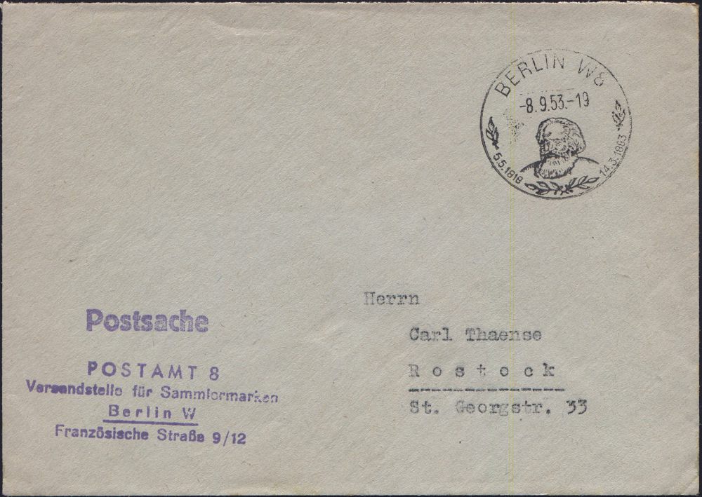 83 | 15 € | ARBEITERBEWEGUNG 1848-1933 : WARNEMÜNDE/ TAG DER BRIEFMARKE 1953 (25.10.) SSt = Brustbild Karl Marx auf passender Frankatur 16 Pf. "70. Todestag K. Marx" (Mi.347 EF) klar gest. Inl.-Karte (Bo.4, nur am 25.10. verwendet!) | ![]() | |