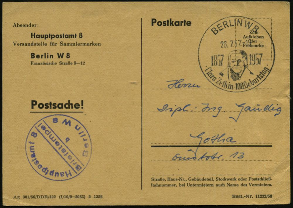 75 | 12 € | ARBEITERBEWEGUNG 1848-1933 : BERLIN W8/ 1857../ Clara Zetkin 100.Geburtstag 1957 (26.7.) HWSt = Brustbild Zetkin + viol. 1K-HdN.: HAUPTPOSTAMT 8.., Postdienst-Kt. (rechts Bugspuren) = Versandstelle (Ost), seltene Verwendung! (Bo.769) | ![]() ![]() | |
