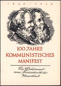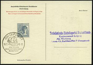 82 | 18 € | ARBEITERBEWEGUNG 1848-1933 : (10b) LEIPZIG C1/ 100 JAHRE/ KOMMUNSITISCHES/ MANIFEST 1948 (18.2.) SSt (Marx-Engels-Köpfe) auf zweifarbiger, motivgleicher Jubil.-Sonder-Kt.: Marx-Engels (Michaelis Nr.20, + 30.- DM,1991) Orts-Kt. an die SED Leipzig, (Bo.207) | ![]() ![]() | |