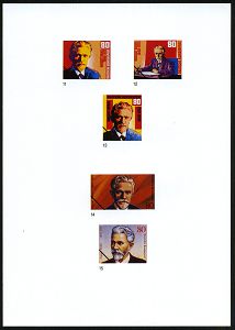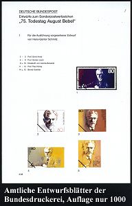 85 | 15 € | ARBEITERBEWEGUNG 1848-1933 : B.R.D. 1988 (Juni) 80 Pf. "75. Todestag August Bebel", 15 verschied. Color-Alternativ-Entwürfe der Bundesdruckerei auf 3 Entwurfs-Blättern kompl., dabei Reichstag-Marke etc.!, Aufl. nur 1000, vergl. Los Nr. 86 (Mi.1382 u.a.) | ![]() ![]() ![]() | |