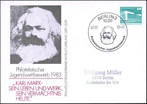 76 | 8 € | ARBEITERBEWEGUNG 1848-1933 : 1020 BERLIN 2/ Phil.Jugendwettbewerb 1983 (2.7.) SSt auf motivgl. PP 10 Pf. "PdR" grün: Karl Marx , Inl.-Kt. (Mi.PP 17/41) | ![]() | |