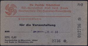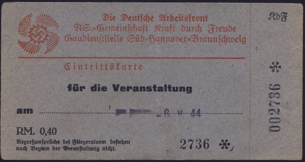 1478 | 16 € | K.d.F.: KRAFT DURCH FREUDE : Hannover / Braunschweig 1944 (6.5.) zweifarbige, orig. Eintrittskarte: Die Deutsche Arbeitsfront für K.d.F.-Veranstaltung (Gau Hann.-Braunschweig mit KdF-Logo) ungebr. mit KdF-Talon | ![]() | |
