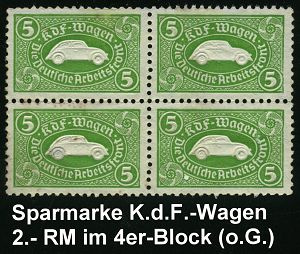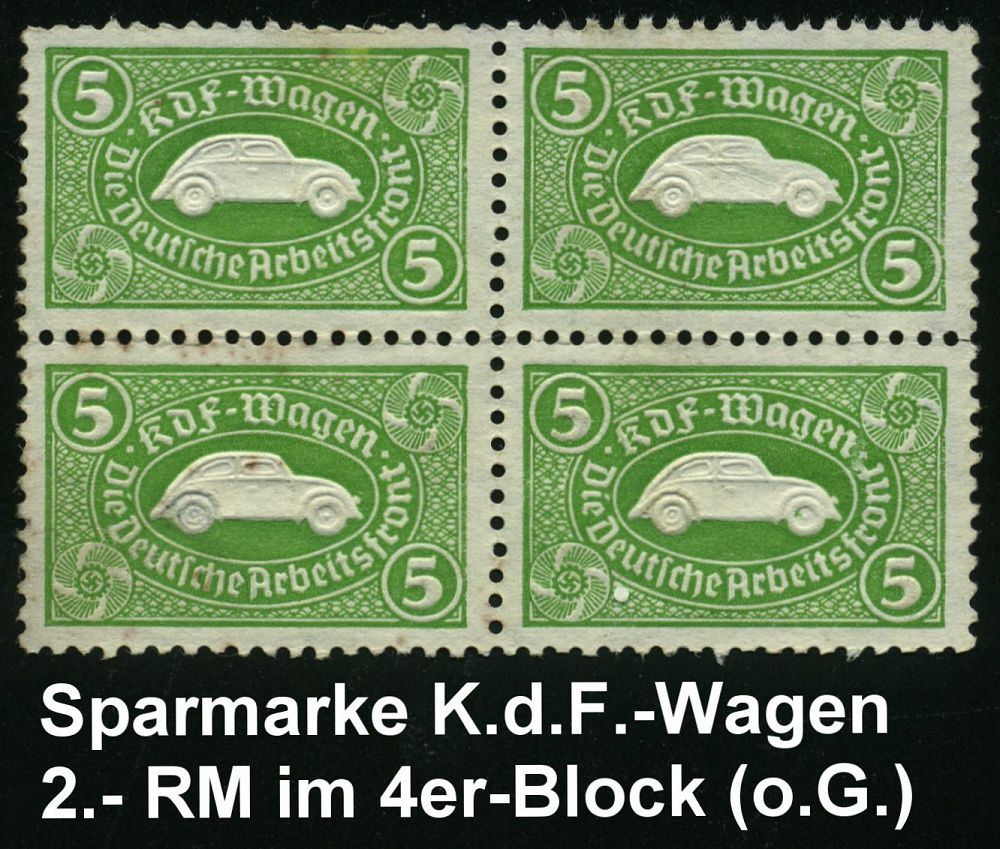 1490 | 70 € | K.d.F.: KRAFT DURCH FREUDE : DEUTSCHES REICH 1938 grüne Sparmarke 5.- RM "K d F - Wagen" , Die Deutsche Arbeitsfront, 4er-Block (mit VW -Blinddruck) o.G. (vergl. auch Vor-Lose) u. Sektion AUTOMOBIL mit Untersektion: Volkswagen, evtl. Einzelausruf möglich: einzeln Ausruf: 20.- EUR (Gesamtgebot hat Vorrang) | ![]() | |