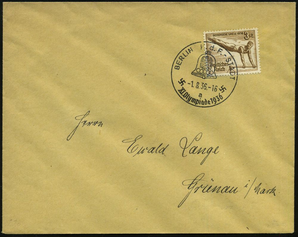 1468 | 18 € | K.d.F.: KRAFT DURCH FREUDE : BERLIN K.d.F.-STADT/ a/ XI.Olympiade 1936 (1.8.) SSt (Olympia-Glocke) auf EF 3 Pf. + 2 Pf. Olympiade (Mi.609) klar gest. Inl.-Bf. + s/w.-Faksimile-Foto: K.d.F.-Stadt (Bo.186 o, UB "a" = Eröffnungstag Olympiade!) | ![]() ![]() | |