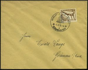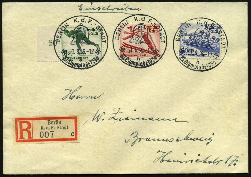 1469 | 45 € | K.d.F.: KRAFT DURCH FREUDE : BERLIN K.d.F.-STADT/ h/ XI.Olympiade 1936 (1.8.) SSt (Olympia-Glocke) 3x auf kompl. Satz Winter-Olympiade (Mi.600/02 + 25.- EUR) + Sonder-RZ: Berlin/ K. d. F. - S t a d t / c, klar gest. Fern-R-Bf., rs. AS. (Bo.186 o, UB h , Eröffnungstag!) | ![]() ![]() | |
