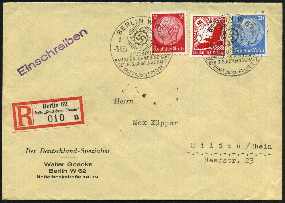 1470 | 35 € | K.d.F.: KRAFT DURCH FREUDE : BERLIN W 62/ d/ DEUTSCHE/ SAMMLER-GEMEINSCHAFT/ ..KRAFT DURCH FREUDE 1937 (3.9.) SSt = K.d.F.-Logo + Sonder-RZ: Berlin 62/ NSG "Kraft durch Freude" , klar gest. Fern-R-Bf. (Bo.241 d) | ![]() | |