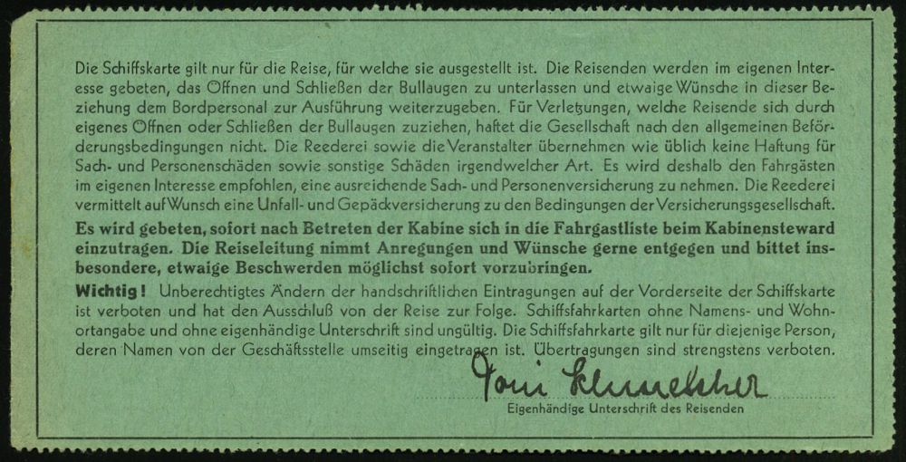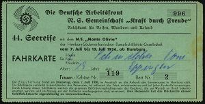 1476 | 18 € | K.d.F.: KRAFT DURCH FREUDE : Hamburg 1936 (Juli) grüne FAHRKARTE "44. Seereise" mit dem MS. "Monte Olivia" (grün, teilgez.) ab Hamburg (Format: 15,3 x 7,7 cm) | ![]() ![]() | |