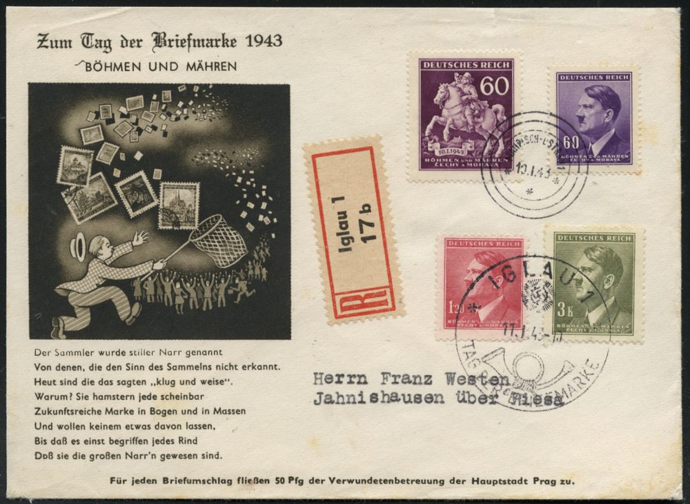 1496 | 23 € | K.d.F.: KRAFT DURCH FREUDE : BÖHMEN & MÄHREN 1943 (10.1./11.1.) SSt: IGLAU 1/TAG DER BRIEFMARKE mit KdF-Logo u. Ring-SSt.: MÄHR.-OSTRAU 1/*** (= Tag der Briefmarke) zusammen auf Spenden-SU.: Tag der Briefmarke mit 60 H.Tag der Briefmarke u.a., Fern-R-Bf.! (Mi.113 u.a.) | ![]() | |