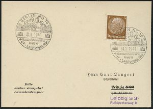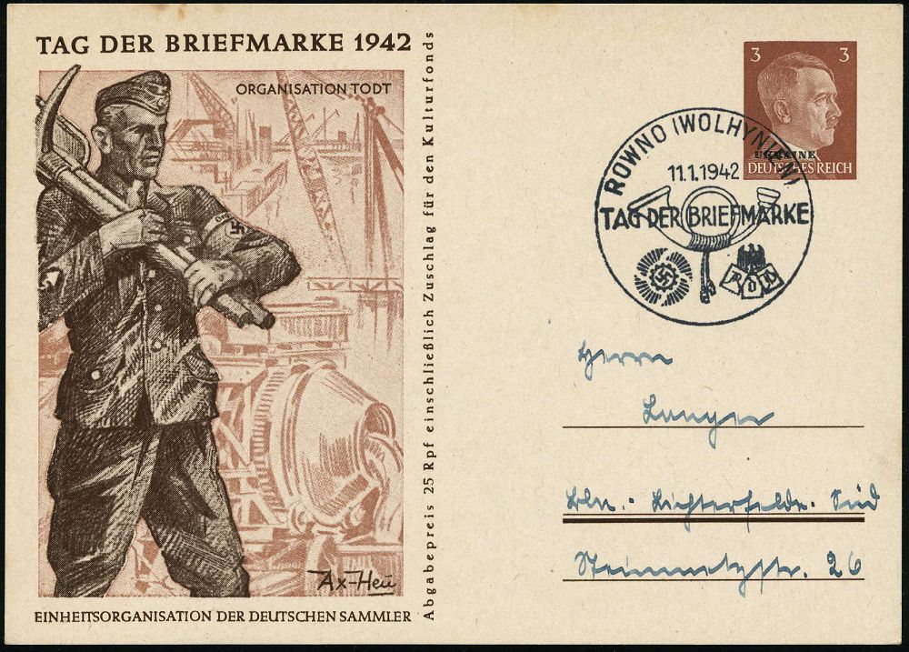 1497 | 20 € | K.d.F.: KRAFT DURCH FREUDE : DT.BES.UKRAINE 1942 (11.1.) SSt: ROWNO (WOLHYNIEN)/TAG DER BRIEFMARKE a.BiP 3 Pf. Hitler: ORGANISATION TODT (Mi.P 4/04), die Ganzsache erschien nicht in der Ukraine, aber im Inland gelaufen! (Auflieferung Berlin) n. Wiesbaden (Bo.1) | ![]() | |