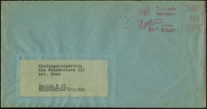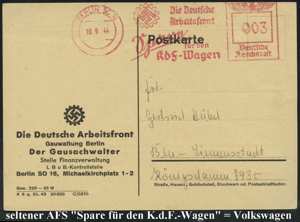 1475 | 150 € | K.d.F.: KRAFT DURCH FREUDE : BERLIN SO 16/ Die Deutsche/ Arbeitsfront/ Spare/ für den/ KdF-Wagen 1944 (10.9.) später, sehr seltener AFS Francotyp "Reichsadler", teils Sütterlin mit Hakenkreuz-Logo (DAF) seltener Firmen-Kt.: Die Deutsche Arbeitsfront, Gauwaltung der Berlin.. LB u, B.-Kontrollstelle, seltene Orts-Karte (Dü.E-5CEo) | ![]() ![]() | |