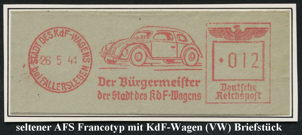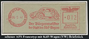 1485 | 35 € | K.d.F.: KRAFT DURCH FREUDE : STADT DES KdF-WAGENS/ bei FALLERSLEBEN/ Der Bürgermeister/ der Stadt des KdF-Wagens 1941 (31.5.) dekorativer u. gesuchter AFS Francotyp "Reichsadler" = VW-Käfer , klar gest., kleines Briefstück (Dü.E-5DGo) | ![]() | |
