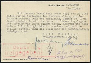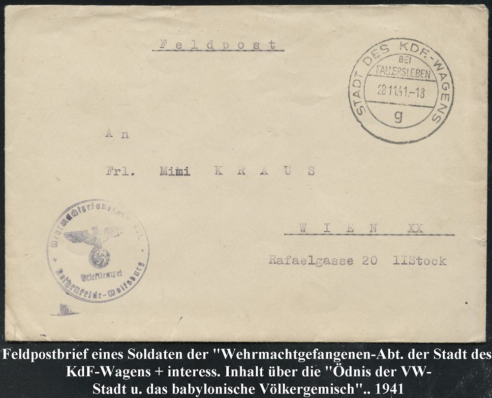 1486 | 75 € | K.d.F.: KRAFT DURCH FREUDE : STADT DES KDF-WAGENS/ BEI/ FALLERSLEBEN/ g 1941 (28.11.) HWSt mit UB "g" + viol. 1K-HdN: Wehrmachtsgefangenen Abt./ Rothenfelde-Wolfsburg = Bewachung des Kriegsgefangen u. Zwangsarbeiter, die im VW-Werk arbeiteten, rs. maschinen-geschriebener Abs., seltener Feldpost-Bf. + Inhalt, Text über das "babylonische Völkergemisch.." n. Wien, 2 seltene Belege kompl.! | ![]() ![]() | |