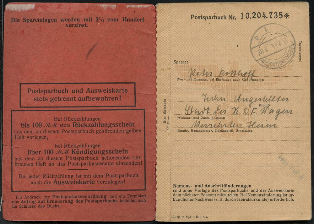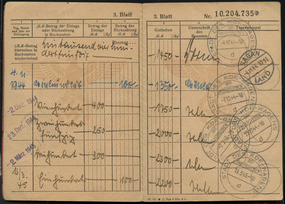 1488 | 250 € | K.d.F.: KRAFT DURCH FREUDE : STADT DES KDF-WAGENS/ BEI FALLERSLEBEN/ d 1944 (1.3.) seltener HWSt mit UB "d" bzw. "f" mehrfach in entnazifiziertem Postsparbuch, überklebt mit hs. Label "Britische Zone" + 2K-Steg: (20) WOLFSBURG 1/d , 13 x HWSt: STADT DES KDF-WAGENS.. + mehrfach Notstpl.: (20) Wolfsburg 1/b (8x) u. vielfach 2K-Steg: WOLFSBURG 1 oder 2, gute Erhaltung, sehr seltenes Dokument ! (1944 bis Okt. 1947) | ![]() ![]() ![]() ![]() | |