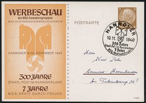 1477 | 20 € | K.d.F.: KRAFT DURCH FREUDE : HANNOVER/ 300 Jahre/ Staatl.Post im Hannoverland/ 7 Jahre/ NSG."KdF" 1940 (10.11.) SSt = 2 Pferdeköpfe mit K.d.F.-Logo auf motivgl. PP 3 Pf. Hindenbg. braun: 300 JAHRE POST/7 JAHRE K.D.F. (Mi.PP 122/C 109) Inl.Kt. (Bo.61) | ![]() | |