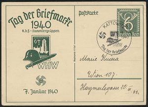 1480 | 18 € | K.d.F.: KRAFT DURCH FREUDE : KATTOWITZ/ WHW/ Tag der Briefmarke 1940 (7.1.) SSt auf motivgl. Sonder-P. 6 Pf. Posthorn, grün: Tag der Briefmarke.. WHW = Danzig-Marke, Stahlhelm, Bajonett, KdF-Logo (Mi.P 288) klar gest. Inl.-Karte (Bo.1) | ![]() | |