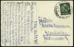 1493 | 20 € | K.d.F.: KRAFT DURCH FREUDE : DEUTSCHES REICH 1936 (4.7.) 2K-Bord-PA: DEUTSCHE SCHIFFSPOST/MS/"Monte Sarmiento"/HSDG/Kraft durch Freude (Nr.1050 = ohne UB) EF 6 Pf. Hindenbg. (Mi.516 EF) s/w.-Foto-Ak.: MS. "Monte Sarmiento" in der Narobucht (Hamburg) Rückkehr Norwegenfahrt, n. Gelsenkirchen | ![]() ![]() | |