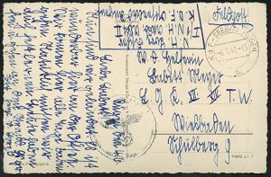 1479 | 40 € | K.d.F.: KRAFT DURCH FREUDE : K d F - SEEBAD RÜGEN/ b 1942 (6.7.) seltener 2K-Steg = KdF-Bad Prora = größtes NS-Massentourismus-Projekt , ab Kriegsbeginn Schulungs- u. Trainingsgelände für Wehrmacht u. Polizei etc. + hs. Abs.: ".. I. 1. N. H. Ausb. Abt. II, K. D. F. Ostseebad Rügen" + entspr. Dienst-HdN, Feldpost-Ak.: Rügen n. Wiesbaden | ![]() ![]() ![]() | |