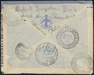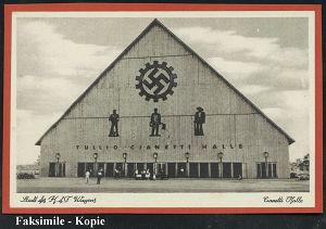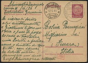 1498 | 80 € | K.d.F.: KRAFT DURCH FREUDE : ITALIEN / STADT DES KDF-WAGENS 1941 (Aug.) HWSt: STADT DES KDF WAGENS/BEI/FALLERSLEBEN/g als Ankunfsstempel an einen italien. Fremdarbeiters "..Campo 12,, K D F in Fallersleben" , italien. 2,75 Lire-Frankatur + provis. R-Zettel: PESCANTINA (bei Verona) italienische Doppelzensur mit Zensurstreifen: VERIFICATO PER CENSURA + mehrfach 2K: UFFICIO CENSURA POSTA ESTERA II etc. + deutsche Durchlauf-Zensur "A d", seltener Beleg! | ![]() ![]() | |