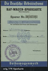 1489 | 130 € | K.d.F.: KRAFT DURCH FREUDE : Weikersheim 1938 (ca.) blaue Sparkarte für den KdF-Wagen der Deutschen Arbeitsfront (blau) viol. KdF-Siegelstempel: Die Deutsche Arbeitsfront/ Gaudienststelle Württemberg-Hohenzollern(NS Gemeinschaft Kraft durch Freude (KdF-Logo) ungebr. ohne Sparmarken, sehr selten! | ![]() ![]() | |