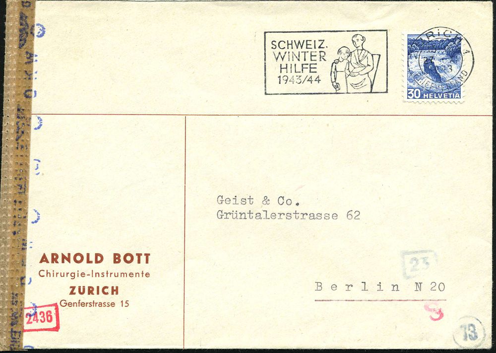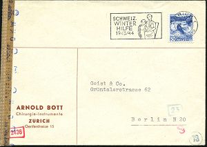 1522 | 15 € | WINTERHILFSWERK / W.H.W. : SCHWEIZ 1943 (27.11.) MWSt: ZÜRICH 1/SCHWEIZ./WINTER/HILFE/1943-44 (Mutter u. Kind) + blauer OKW-Zensur-Band.Ma.St. + neutraler Streifen (= München, Rie.D-21) Ausl.-Zensur-Bf. n.Berlin | ![]() | |