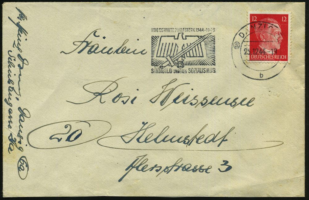 1505 | 25 € | WINTERHILFSWERK / W.H.W. : (5a) DANZIG 5/ b/ KRIEGSWINTERHILFSWERK 1944-45.. 1944 (25.12.) seltener Serien-MWSt mit Postleitgebietszahl (Bf. rs. Klappenmäng.) klar gest. Fern-Bf. (Bo.S 424 A mit PLGZ, Handbuch Nr.40 + 60.- EUR, 2004) | ![]() | |
