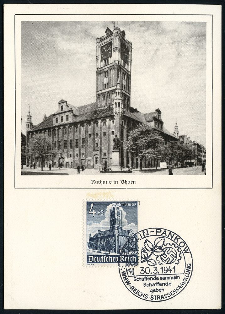 1501 | 15 € | WINTERHILFSWERK / W.H.W. : BERLIN-PANKOW/ 7.WHW-REICHS-STRASSENSAMMLUNG.. 1941 (30.3.) SSt = Hagebutte auf WHW 4 + 3 Pf. Rathaus Thorn (Mi.752), klar gest. Maximum-Kt. (Bo.357) | ![]() | |
