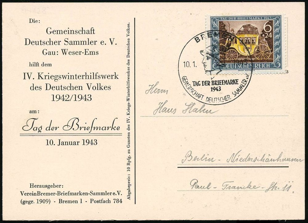 1504 | 20 € | WINTERHILFSWERK / W.H.W. : BREMEN/ TAG DER BRIEFMARKE/ GDS 1943 (10.1.) SSt = Merkur-Kopf (mit Flügelhelm) auf passender EF 6 + 24 Pf. Tag der Briefmarke (Mi.828), seltene KWHW-Sonderkarte: Tag der Briefmarke (Bo.36) | ![]() ![]() | |