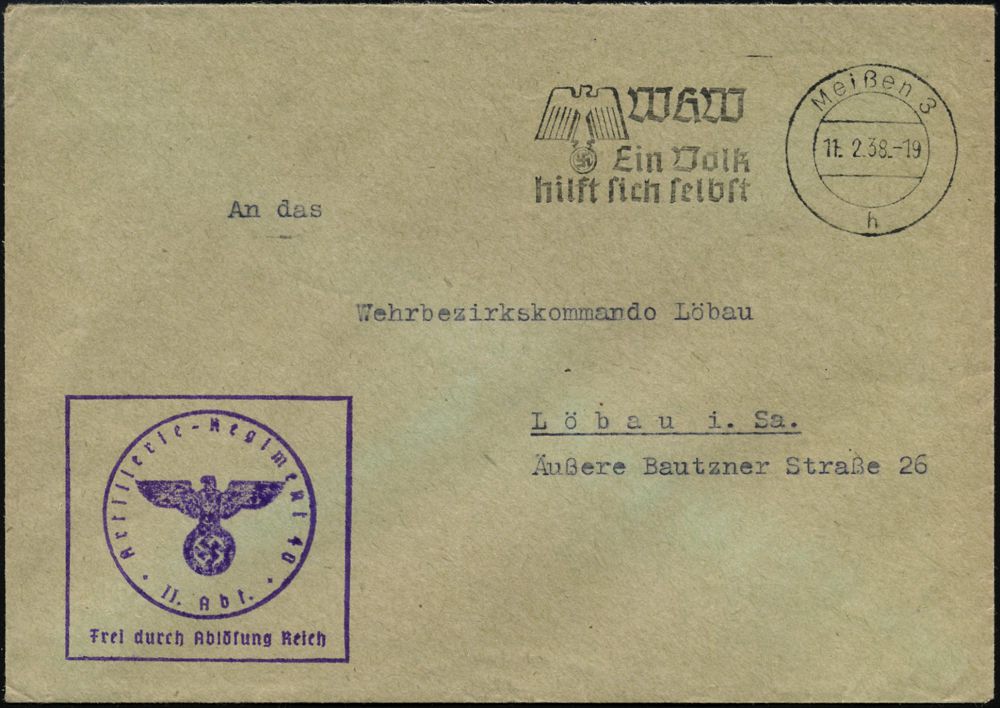 1514 | 16 € | WINTERHILFSWERK / W.H.W. : Meißen 3/ b/ WHW/ Ein Volk/ hilft sich selbst 1938 (11.2.) Serien-MWSt, Ortsname Groß- u. Kleinschrift = Sondertype! + viol. Ra.: FdAR/ Artillerie-Regiment 40, klar gest., markenloser Wehrmachts-Dienstbf. n. Löbau (Bo.S 269 A) | ![]() | |