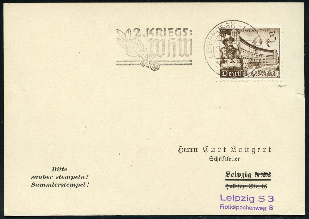 1513 | 25 € | WINTERHILFSWERK / W.H.W. : LEVERKUSEN-I.G. WERK/ e/ 2.KRIEGS-/ WHW 1941 (17.3.) sehr seltener Serien-MWSt = Hauspostamt IG.-Werk! auf Inl.-Karte (minim. Rißchen) klar gest.! (Bo.S 368 A) | ![]() | |