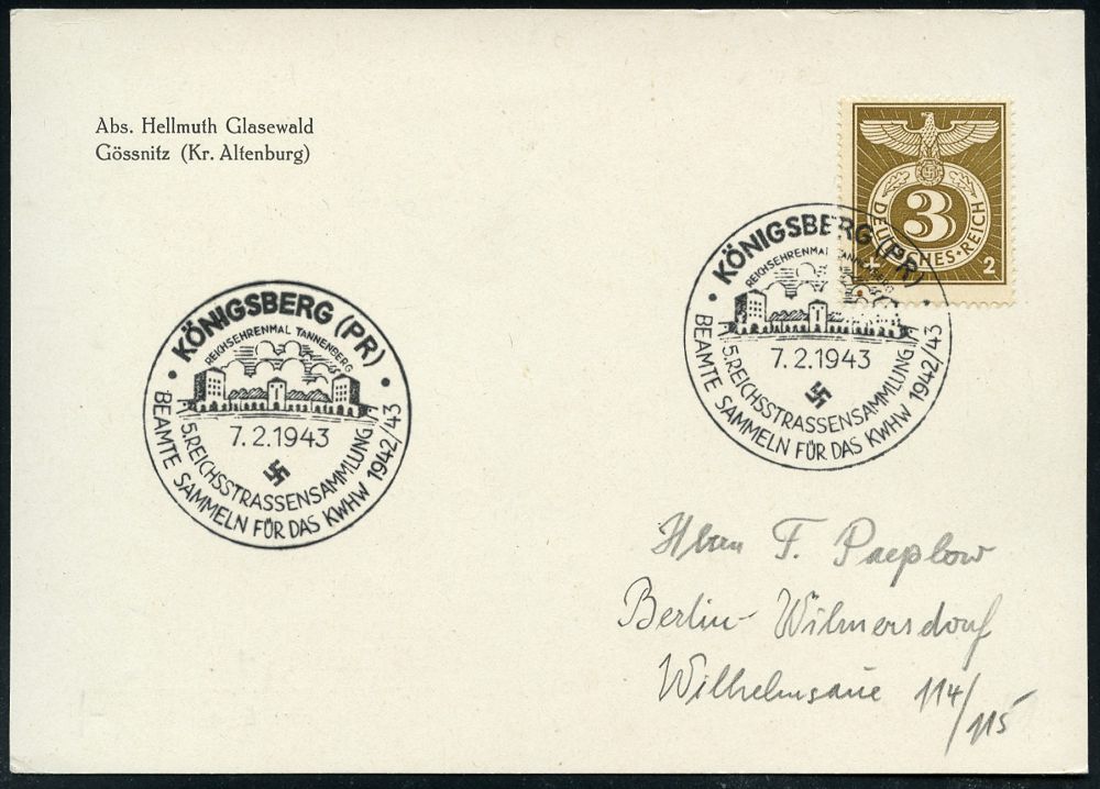 1512 | 18 € | WINTERHILFSWERK / W.H.W. : KÖNIGSBERG (PR)/ 5.REICHSSTRASSENSAMMLUNG/ ..FÜR DAS KWHW 1943 (7.2.) SSt = Reichsehrenmal Tannenberg, Hindenburg-Mausoleum, klar gest Inl.-Karte (Bo.41) | ![]() | |