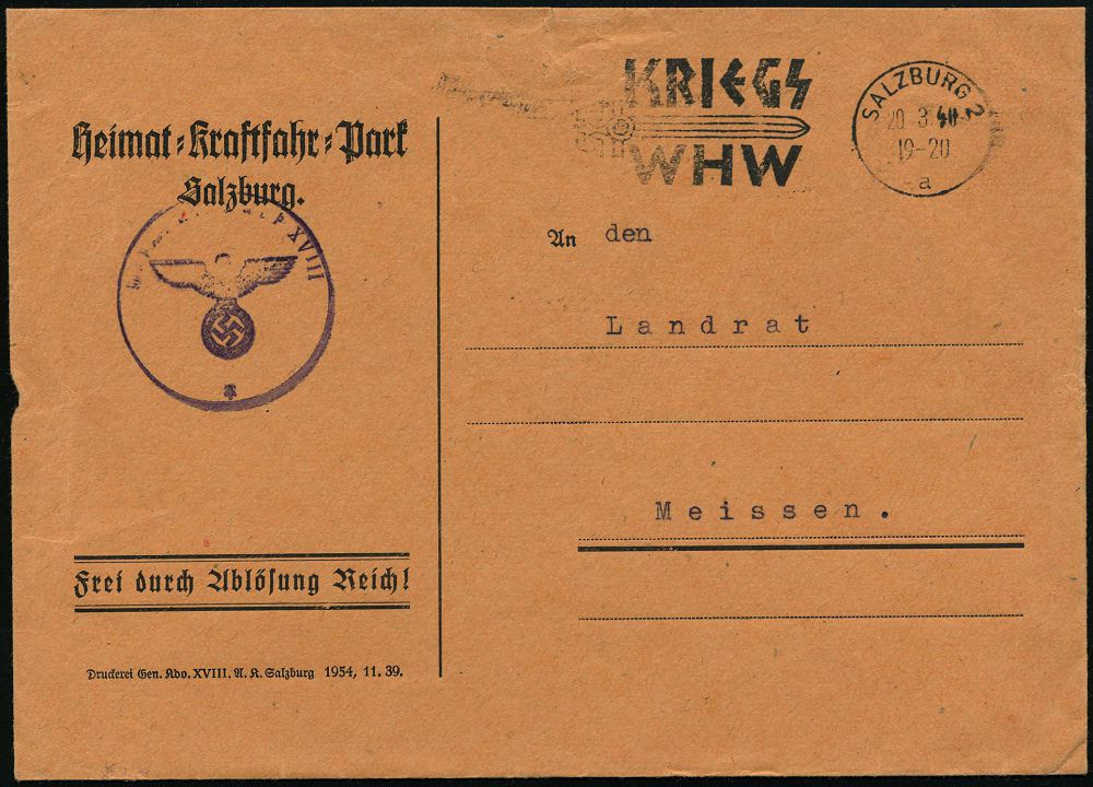 1517 | 16 € | WINTERHILFSWERK / W.H.W. : SALZBURG 2/ a/ KRIEGS/ WHW 1940 (20.3.) seltener Serien-MWSt (Schwert) auf Dienst-Bf.: Heimat-Kraftfahr-Park Salzburg/ FdAR (Bo.S 348 A , nur 2 1/2 Monate in nur 9 Orten!) | ![]() | |