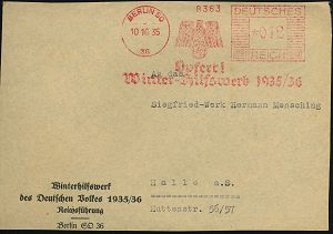 1499 | 20 € | WINTERHILFSWERK / W.H.W. : BERLIN SO/ 36/ Opfert!/ Winter-Hilfswerk 1936-37 1936 (5.12.) seltener AFS Francotyp "Mäanderrechteck" (WHW-Hakenkreuz-Adler) auf Bedarfs-Vorderseite: Winterhilfswerk des Deutschen Volkes 1936-37 Reichsführung.., (Dü.E-2Ah , nur kurze Verwendungszeit) | ![]() | |